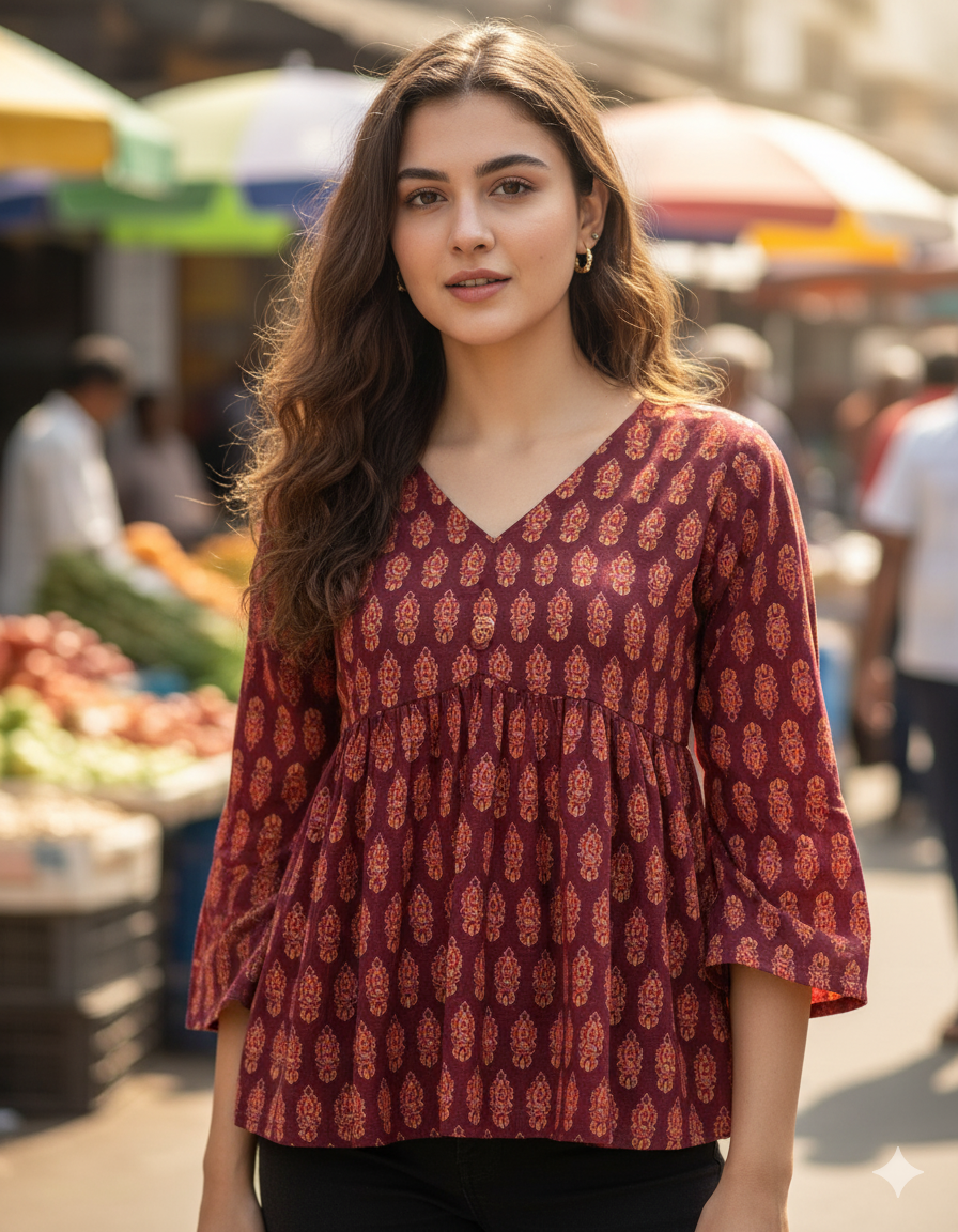Add a touch of ethnic charm to your everyday wardrobe with this beautifully designed Maroon Printed Cotton Flared Top. Crafted from pure cotton, this top offers ultimate comfort, breathability, and a relaxed fit suitable for all-day wear.