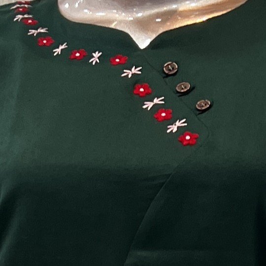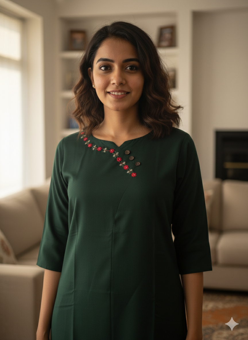 Elegant Deep Green Cotton Straight Kurta with Contrast Embroidered Neck