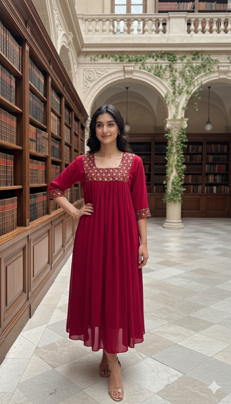 Crafted from premium Georgette fabric, the dress offers a beautiful, fluid drape that moves gracefully with every step. Its lightweight and breathable nature ensures exceptional comfort, allowing you to stay cool and chic all day long.
