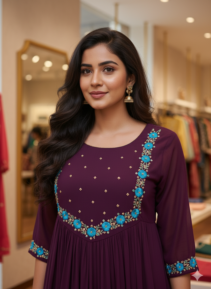 Experience elegance redefined with our Plum Embroidered Anarkali Kurta. Crafted from premium, flowing Georgette fabric, it offers a lightweight feel and an exquisite, flattering drape. The signature crinkle texture of the Georgette adds sophistication, while the intricate blue and teal embroidery at the neckline ensures you stand out. This piece perfectly balances traditional grace with modern comfort.